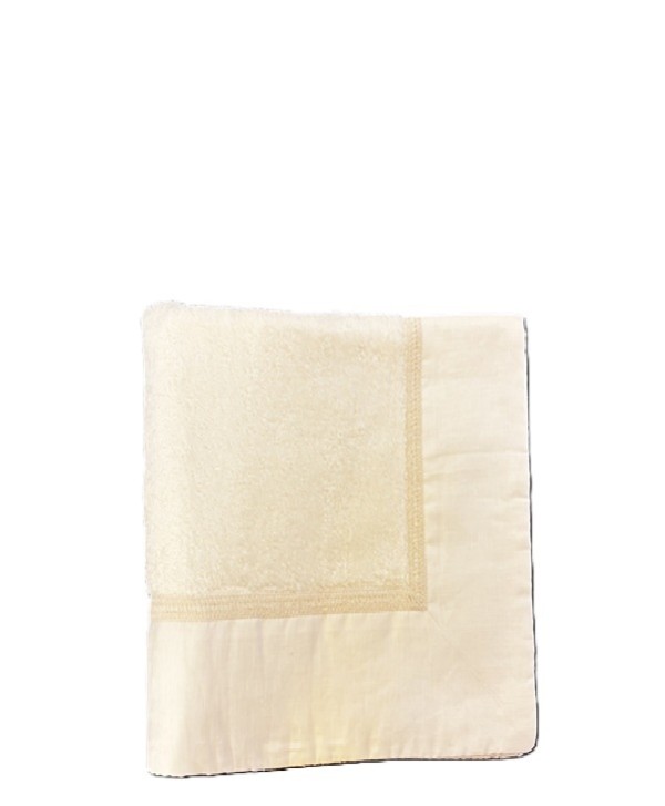 Il tappeto della collezione Macramè di Tessitura Calabrese è realizzato in spugna 100% cotone di colore ecru. Il bordo ha una balza in lino ecru, impreziosita da un ricamo a colonnine.