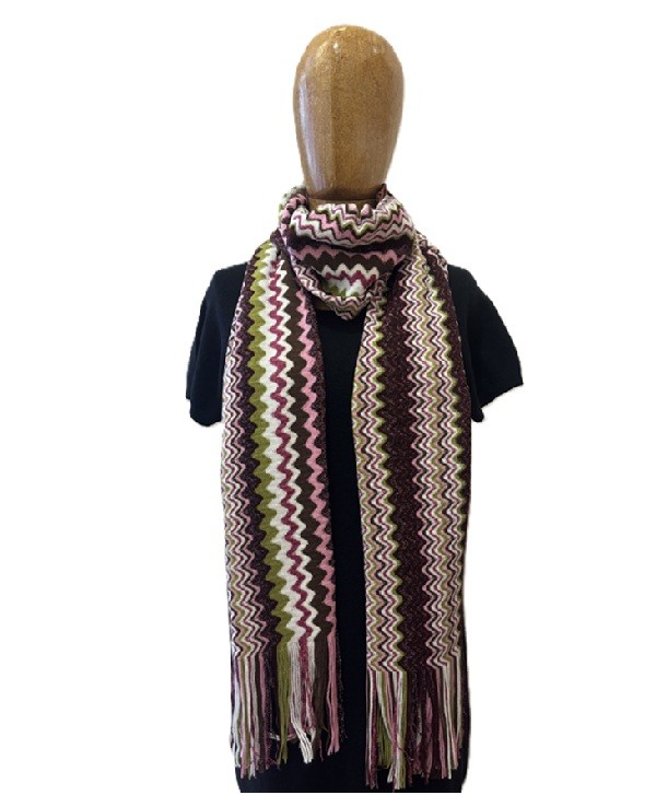 Sciarpa realizzata in lana e viscosa con il tipico stile del marchio Missoni con motivi a zig zag impreziosita da lurex fuxia e prugna.