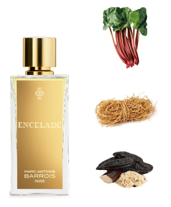 Encelade di Marc-Antoine Barrois è un profumo potente ed accattivante, un sogno mitologico che può diventare realtà. Encelado è infatti un satellite naturale di Saturno coperto di neve, ghiaccio e acqua dolce ma con un nucleo interno riscaldato. Ecco che Marc Antoine Barrois immagina che la lava di un vulcano esploda in una giungla verde e lussureggiante ed è così che immagina la nascita della vita su Encelado, l'augurio di un nuovo futuro. L'accordo principale di rabarbaro, cedro e vetiver descrivono l'odore della terra viva, il legno di sandalo e la fava tonka la potenza, il carattere e la seduzione del vulcano. Encelade è anche un personaggio mitologico, figlio di Gaia (la Terra) e di Urano (il Cielo), la cui leggenda narra che sia sepolto in Sicilia e respiri attraverso i fumi e le eruzioni dell'Etna