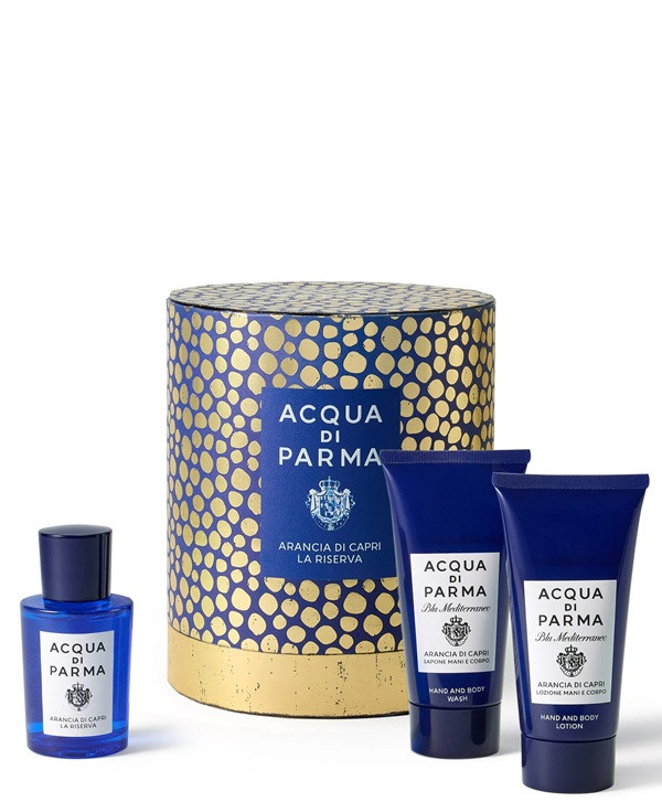 La Cappelliera Arancia di Capri La Riserva è una confezione regalo di Acqua di Parma decorata con l'audace reinterpretazione grafica dell'artigianato tradizionale proposta da Cristina Celestino. La cappelliera contiene Arancia di Capri La Riserva Eau de Parfum da 50ml, una fragranza con note di arancia rossa appena sbucciata che si uniscono a frizzanti note minerali di brezza marina che trasportano i sentori aromatici del rosmarino selvatico e le note di essenza di cedro e accordo di cuoio. Ad aumentarne l'intensità e la piacevolezza, in omaggio, 2 pratici prodotti corpo: il Sapone Mani e Corpo (75ml) che deterge delicatamente e la Lozione Mani e Corpo (75ml) idratante e nutriente.