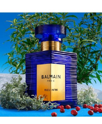 Bleu Infini Eau de Parfum di Balmain è una fragranza che trae ispirazione da Villa Balmain, il rifugio modernista di Pierre Balmain sull' isola d' Elba. Il lichene sprigiona una nota olfattiva verde che ricorda la freschezza di un paesaggio costiero dopo una mareggiata. La vivacità speziata del pepe rosa incontra la profondità balsamica del cisto assoluto , infine una scia legnosa e sobria dona una sensazione di calore. Un intreccio tra freschezza marina e calore mediterraneo per indossare una fragranza moderna ed elegante.